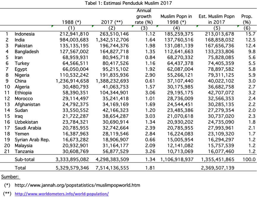 Kita dapat mengestimasi populasi muslim tahun 2017 berdasarkan angka-angka itu. Hasilnya adalah daftar estimasi populasi muslim di negara-negara muslim tadi sebagaimana ditunjukkan oleh kolom 5 Tabel 1. Secara keseluruhan total populasi di negara-negara itu mencapai 1.3 milyar. Dalam hal ini Indonesia “paling unggul” dengan mencakup 15.7% dari total, diikuti India (12.5%) dan Pakistan (12.4%). Di sini kita mengasumsikan pertumbuhan penduduk populasi muslim dan non-muslim di negara yang bersangkutan sama.