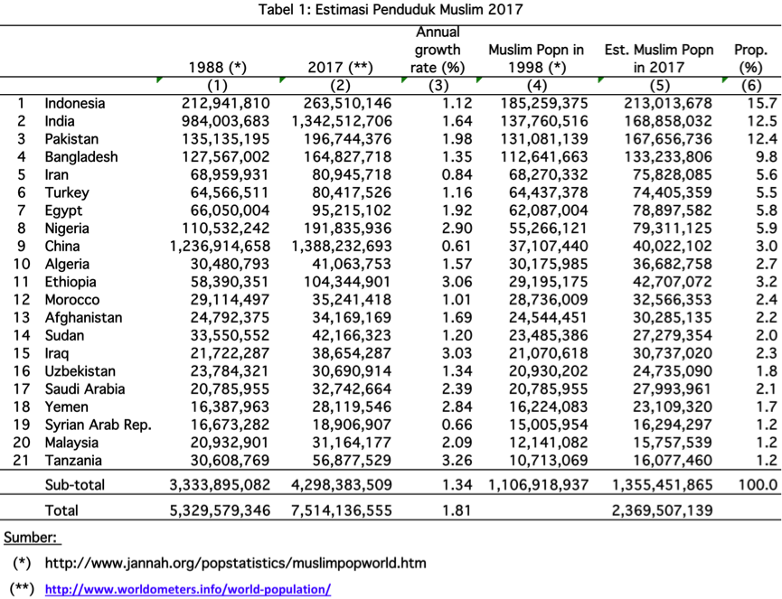 Kita dapat mengestimasi populasi muslim tahun 2017 berdasarkan angka-angka itu. Hasilnya adalah daftar estimasi populasi muslim di negara-negara muslim tadi sebagaimana ditunjukkan oleh kolom 5 Tabel 1. Secara keseluruhan total populasi di negara-negara itu mencapai 1.3 milyar. Dalam hal ini Indonesia “paling unggul” dengan mencakup 15.7% dari total, diikuti India (12.5%) dan Pakistan (12.4%). Di sini kita mengasumsikan pertumbuhan penduduk populasi muslim dan non-muslim di negara yang bersangkutan sama.