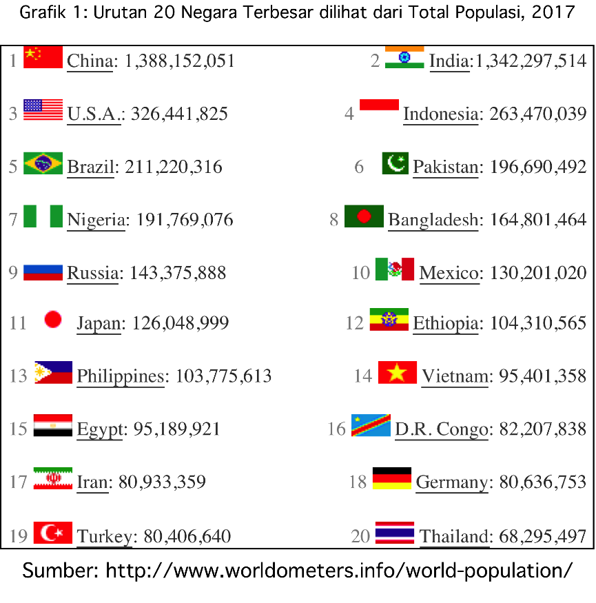 Jumlah penduduk bervariasi antar negara tetapi menonjol di 20 negara sebagaimana disajikan dalam Grafik 1. Dua negara terbesar yaitu China dan India sudah mencakup sekitar 2.7 milyar atau lebih dari sepertiga penduduk global.