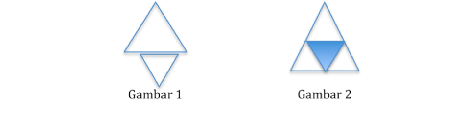 Bagaimana agar segitiga yang di bawah dimasukkan ke dalam segitiga yang di atasnya sedemikian rupa sehingga menutupi yang pertama secara sempurna. Menurut Guénon (ibid), yang juga ahli matematika, caranya adalah dengan menarik satu garis tengah secara horizontal pada segitiga yang di atas dan menjadikan garis tengah itu sebagai “alas” bagi segitiga yang mengarah ke bawah. Hasilnya adalah “klop” dengan 4 segitiga: satu mengarah ke bawah, yang lainnya ke atas sebagaimana ditunjukkan oleh Gambar 2. Guénon (ibid) memaknai hasilnya ini sebagai simbol “Segel Sulaiman” (“Seal of Solomon”).