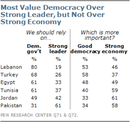 Umat di empat negara Arab ini, bersama Umat di Turki dan Pakistan, secara umum mendukung hak-hak dan kelembagaan demokrasi yang spesifik, termasuk soal sistem pemilu multi-partai dan kebebasan berpendapat. Dengan mendukung nilai-nilai demokrasi tidak berarti Umat mengabaikan pentingnya faktor lain khususnya kekuatan pemimpin untuk menyelesaikan persoalan negara.