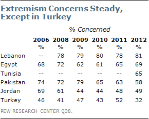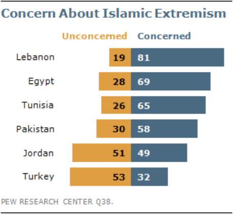 Hasil Survei menunjukkan bahwa di enam negara yang diperbandingkan, mayoritas responden menyatakan keprihatinannya terhadap kelompok ekstremisme. Ini berlaku di semua negara tetapi untuk Lebanon kadarnya mencolok. Tidak ada penjelasan mengenai ini. Secara spekulatif dapat dikatakan alasannya mungkin kedekatan geografis negara ini dengan lokus utama perseteruan Palestina-Israil.