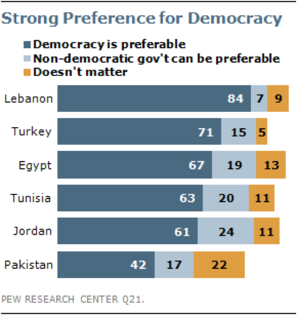 Umat di empat negara Arab ini, bersama Umat di Turki dan Pakistan, secara umum mendukung hak-hak dan kelembagaan demokrasi yang spesifik, termasuk soal sistem pemilu multi-partai dan kebebasan berpendapat. Dengan mendukung nilai-nilai demokrasi tidak berarti Umat mengabaikan pentingnya faktor lain khususnya kekuatan pemimpin untuk menyelesaikan persoalan negara.