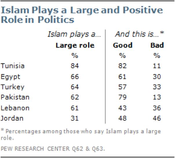 Mayoritas responden menilai Islam memainkan peran besar dalam politik dan itu dinilai “baik”. Dalam hal ini catatan khusus perlu diberikan untuk Yordania. Bagi negara ini, responden yang menyatakan Islam memainkan peranan besar dalam politik relatif rendah proporsinya yaitu hanya 31%. Selain itu, sebagian mereka menilai peranan besar itu baik atau buruk dengan proporsi yang tidak jauh berbeda: baik: 48%, buruk: 46% (Tabel 2). Pola angka-angka itu mungkin mungkin terbentuk karena Yordania menganut sistem kerajaan sehingga isu demokratis dianggap tidak terlalu relevan buat mereka. Mungkin.