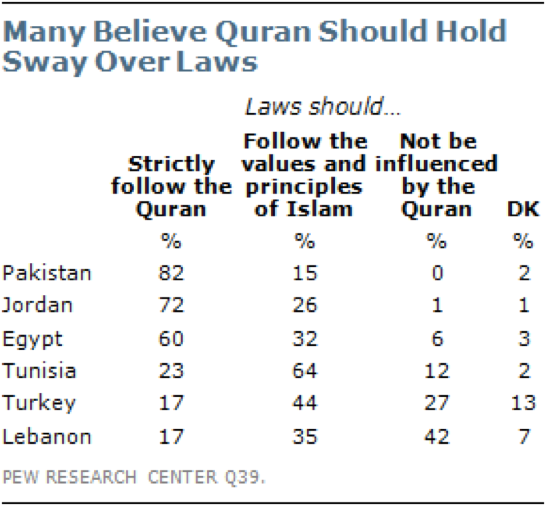 Mengenai hal ini jawaban responden bervariasi antar negara yang diperbandingkan. Mayoritas responden di Pakistan, Yordania dan Mesir menilai Al-Quran seharusnya diikuti secara ketat. Bagi Tunisia yang utama adalah mengikuti “nilai dan prinsip” Al-Quran.