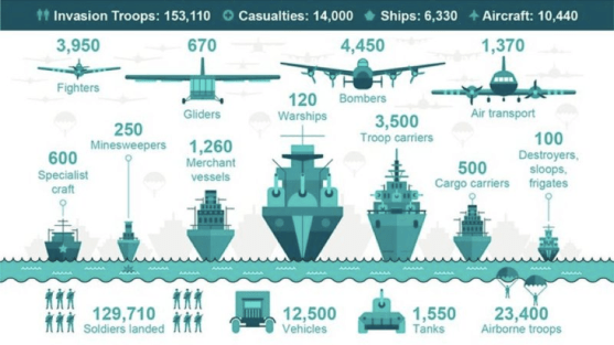 Pendaratan laut yang bersejarah itu adalah terbesar dalam sejarah manusia. Ia melibatkan hampir 5,000 kapal pendarat dan penyerang, 280 kapal pengawal, 277 kapal penyapu ranjau. Tentara yang mendarat: 160,000 pada hari pertama dan 875,000 pada akhir Juni. Korban: 1,000 pihak Poros dan paling tidak 10,000 pihak Sekutu.