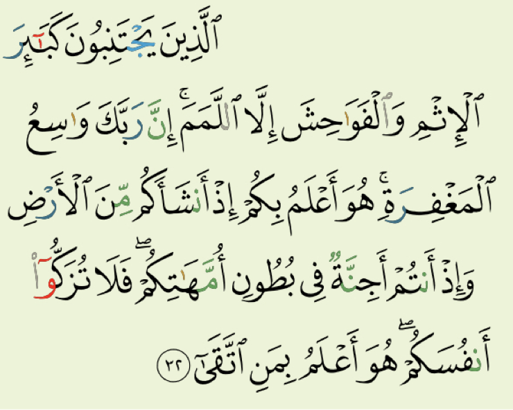 “(Yaitu) mereka yang menjauhi dosa-dosa besar dan perbuatan keji, kecuali kesalahan-kesalahan kecil (teks: allamam). Sungguh Tuhan Maha Luas amnpunan-Nya. Dia mengetahui tentang kamu sejak Dia menjadikan kamu dari tanah, lalu ketika kamu masih janin dalam perut ibumu. Maka janganlah menganggap dirimu suci. Dia mengetahui orang yang bertakwa (QS 53:32).