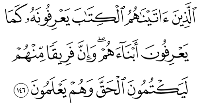 Orang-orang yang telah Kami berikan Kitab (Taurat dan Injil) mengenalnya (Muhammad) seperti mengenal anak-anak mereka sendiri. Sesungguhnya sebagian mereka pasti menyembunyikan kebenaran padahal mereka mengetahui (nya).