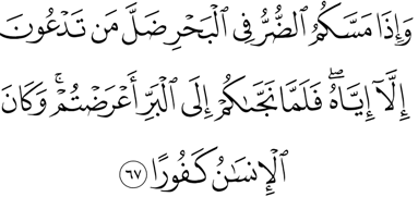 Dan apabila kamu ditempa bahaya di lautan, niscaya hilang semua yang (biasa) kamu seru kecuali Dia. Tetapi ketika Dia menyelamatkan kamu, ke daratan, kamu berpaling (dari-Nya). dan manusia memang selalu ingkar (tidak bersyukur) (QS (17:67)).