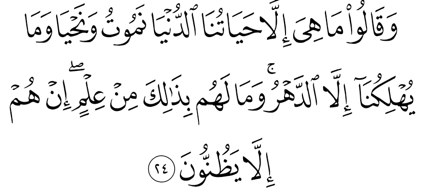 Dan mereka berkata, “Kehidupan ini tidak lain hanyalah kehidupan di dunia ini saja, kita dan mati dan hidup, dan tidak ada yang membinasakan kita seain masa. Tetapi mereka tidak mempunyai ilmu tentang itu, mereka hanyalah menduga-menduga saja ((QS(45:24)