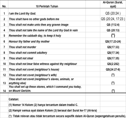 Tabel 1 menunjukkan hampir semua dari 10-Perintah-Tuhan (Kolom 2) ada padanannya dalam Al-Quran (Kolom 3). Tiga perintah pertama (No 2-4) tidak lain dari pada ajaran Keesaan Tuhan atau ajaran Tauhid dalam terminologi Islam. Selain ajaran tauhid, Kolom 3 menunjukkan ada enam perintah lainnya yang ada padananya dalam Al-Quran. Fakta ini– kesamaan ajaran Tauhid dan enam ajaran lainya– selayaknya menjadi pijakan bersama, common denominator, atau kalimatun sawa (dalam istilah Al-Quran) bagi Umat agama-agama samawi yaitu Umat Yahudi, Umat Kristen, dan Umat Islam. Gelar Al-Quran untuk dua Umat yang pertama adalah ahli kitab, suatu gelar terhormat.
