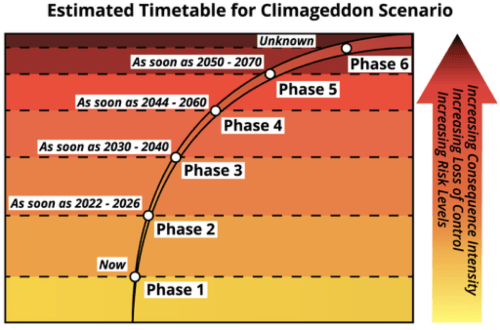 Kini kita berada pada Fase-1 Climgeddon dengan suhu global 1.7º-2.2º Celsius di atas level pra-industri. Dalam fase ini kita sudah menyaksikan berbagai bencana yang semakin sering dan parah. Ini daftar pendeknya (Sumber: https://www.joboneforhumanity.org/climageddon_scenario):