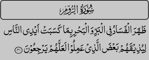 Telah tampak kerusakan di darat dan di laut disebabkan karena perbuatan tangan manusia; Allah menghendaki agar mereka merasakan sebagian dari (akibat) perbuatan mereka, agar mereka kembali (ke jalan yang benar) (QS 30:41).