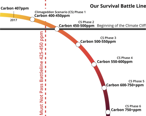Pemanasan global pararel dengan peningkatan konsentrasi gas rumah kaca (khususnya karbon) di atmosfer bumi. Tiga tahun lalu (2017) konsentrasi gas karbon sekitar 407 satuan per juta atau 407 ppm (part per million). Dalam Fase 1 (sekarang), konsentrasi itu diperkirakan 400-450 ppm dengan titik tengah 425 ppm. Angka 425 ppm ini disebut sebagai ”garis perang” (battleline) yang tidak boleh dilewati; jika tidak, dalam waktu kurang dari satu dekade konsentrasi karbon akan mencapai 450. Dengan konsentrasi sebesar itu maka kita akan memasuki era yang bernama bencana iklim (Climate Cliff) yang sukar dibayangkan dampaknya (lihat grafik).