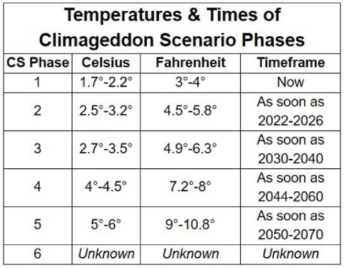 Sekarang ini rata-rata suhu global 1.7º-2.2º Celsius di atas rata-rata sebelum era industri (1950-an). Angka idealnya adalah 1.5º Celsius sehingga kita sebenarnya telah memasuki Fase 1 dalam skenario Climgeddon. Berdasarkan pengalaman masa lalu dan dengan mengasumsikan kita secara kolektif melakukan kegiatan normal tanpa ada upaya radikal untuk menghindari maka dalam 2-6 tahun ke depan (2022) kita akan memasuki Fase 2. Dalam fase ini suhu global diprediksi akan mencapai 2.5º-3.2º Celsius (lihat Tabel).