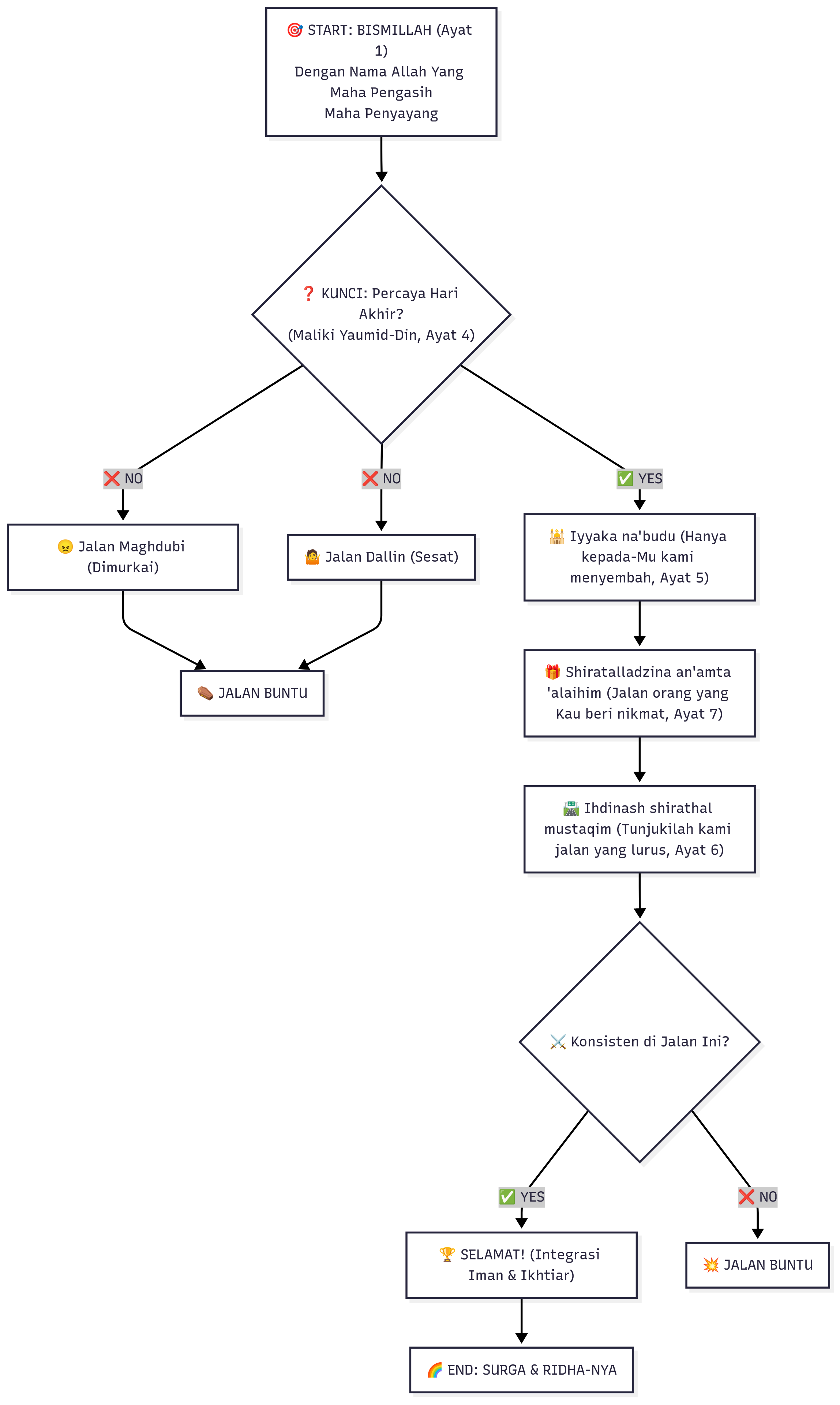Diagram ini menunjukkan dua jalan: ⬅️ JALAN KIRI (NO): Tidak percaya Hari Akhir? Langsung game over. Akhirnya adalah kemurkaan dan kesesatan. ➡️ JALAN KANAN (YES): Percaya? Maka kita memilih untuk menyembah-Nya, bersyukur, dan terus memohon petunjuk. Tapi bukan cuma sekali! Ujian terbesarnya adalah KONSISTENSI.