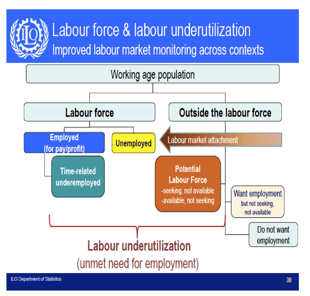 It is worth noting that while the first component mentioned above belongs to labour force, the third belongs to “outside labour force” as generally understood. A reference for ICLS-19 can be accessed HERE.