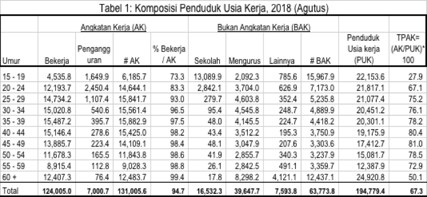 According to Sakernas 2018 or the 2018 Indonesia’s Labor Force Survey, the estimated total of the working age population (WAP) of Indonesia (2018 ILFS) is around 194.8 million. Out of the total, 131 million are classified as labor force (LF) and seven million are the unemployed. The unemployment rate is then about 5.3%.