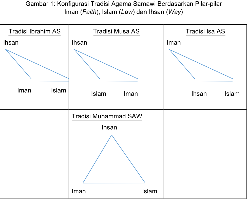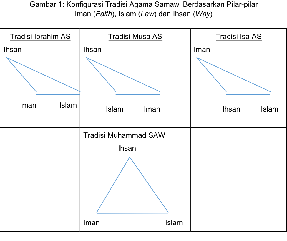 Jika diizinkan menggunakan analogi dalam trigonometri, kita dapat menyajikan konfigurasi tradisi Ibrahimik sebagaimana diiulstrasikan oleh Gambar 1. Pada gambar itu tampak sudut sangat besar (lebih dari 90 derajat) yang merepresentasikan Pilar Iman untuk konfigurasi Tradisi Ibrahim. Konfigurasi tradisi Musa AS dan tradisi Isa AS juga menyerupai segitiga yang sama tetapi dengan sudut sangat besar masing-masing pada Pilar Islam dan Pilar Ihsan. Konfigurasi tradisi Muhammad SAW berbeda; semua pilar memiliki sudut yang sama besar (60 derajat) sehingga membentuk segitiga sama-sisi (lihat Gambar 1).