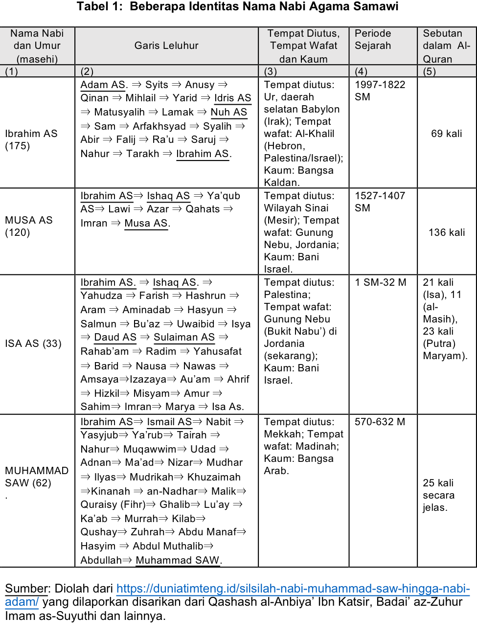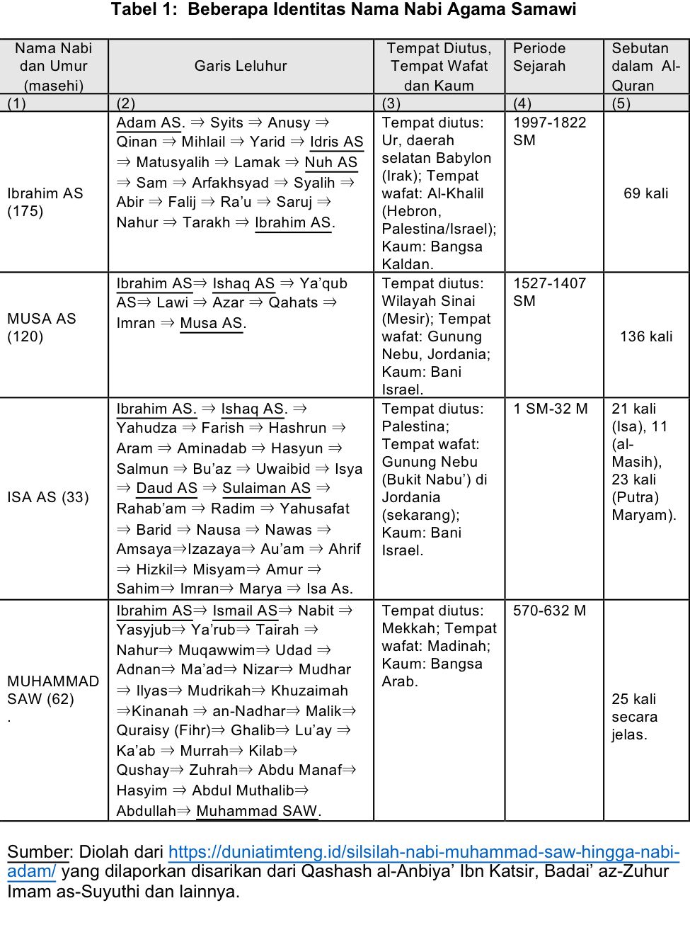 Tabel 1 menyajikan beberapa identitas empat Nabi besar agama samawi yaitu Ibrahim AS, Musa AS, Isa AS dan Muhammad AS. Pada tabel itu tampak bahwa tiga yang terakhir adalah keturunan Ibrahim AS. Yang pertama secara genealogis tersambung dengan Adam AS, sebagai keturunan ke-19. Termasuk dalam leluhur Ibrahim AS adalah Idris AS dan Nuh AS yang masing-masing keturunan Adam AS yang ke-6 dan ke-9. Semua nabi, bahkan semua manusia dan makhluk hidup lainnya, seterlah Era Nuh AS, adalah keturunan beliau atau yang diselamatkan oleh perahu beliau dari bencana bah yang bersifat global.