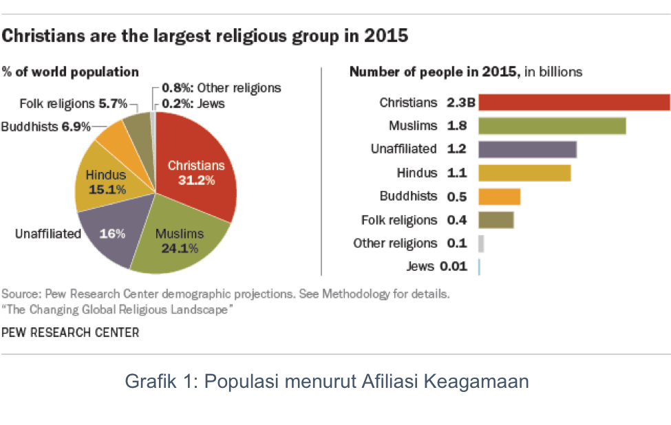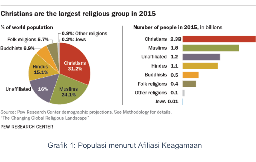 Dugaan bahwa satu-dari-empat penduduk global  Muslim didasarkan pada hasil suatu analisis demografis oleh PEW Research Center (selanjutnya PEW) yang menunjukkan bahwa pada tahun 2015 ada sekitar 7.3 milyar penduduk global dan 1.8 milyar atau 24.1% di antarnya adalah Muslim[1]. Angka-angka ini menempatkan Islam pada urutan kedua agama terbesar dilihat dari jumlah pengikutnya, setelah Kristen yang diperkirakan memiliki pengikut sekitar 2.3 milyar atau 31.2% dari populasi global[2]. Menurut proyeksi PEW, sekitar tahun 2070 Muslim diperkirakan akan mengungguli Kristen karena alasan demografis: rata-rata anak per keluarga 2.2 bagi rumah tangga Kristen dan 2.7 bagi rumah tangga Muslim. Dengan angka kelahiran seperti itu maka Islam adalah agama tercepat pertumbuhan populasi penganutnya.